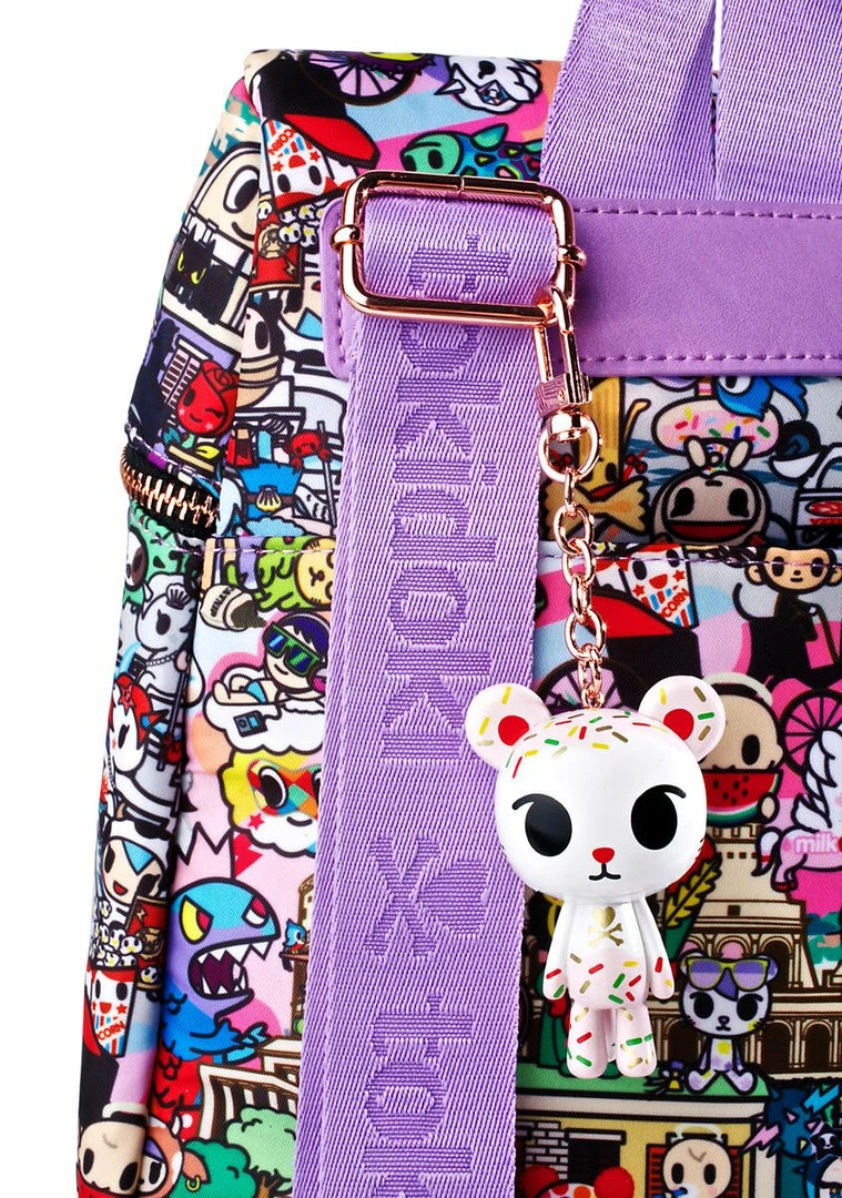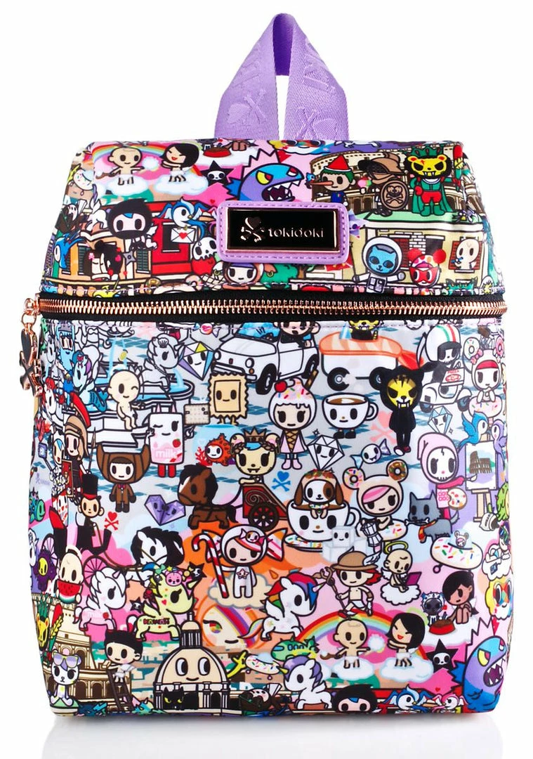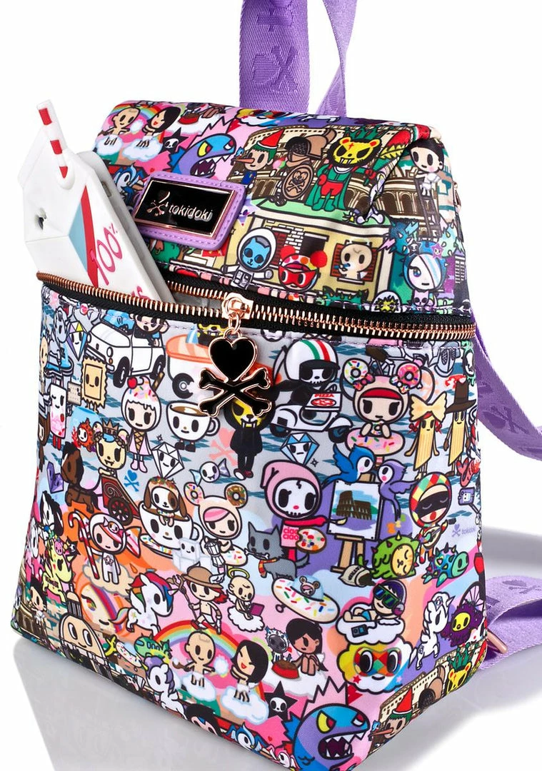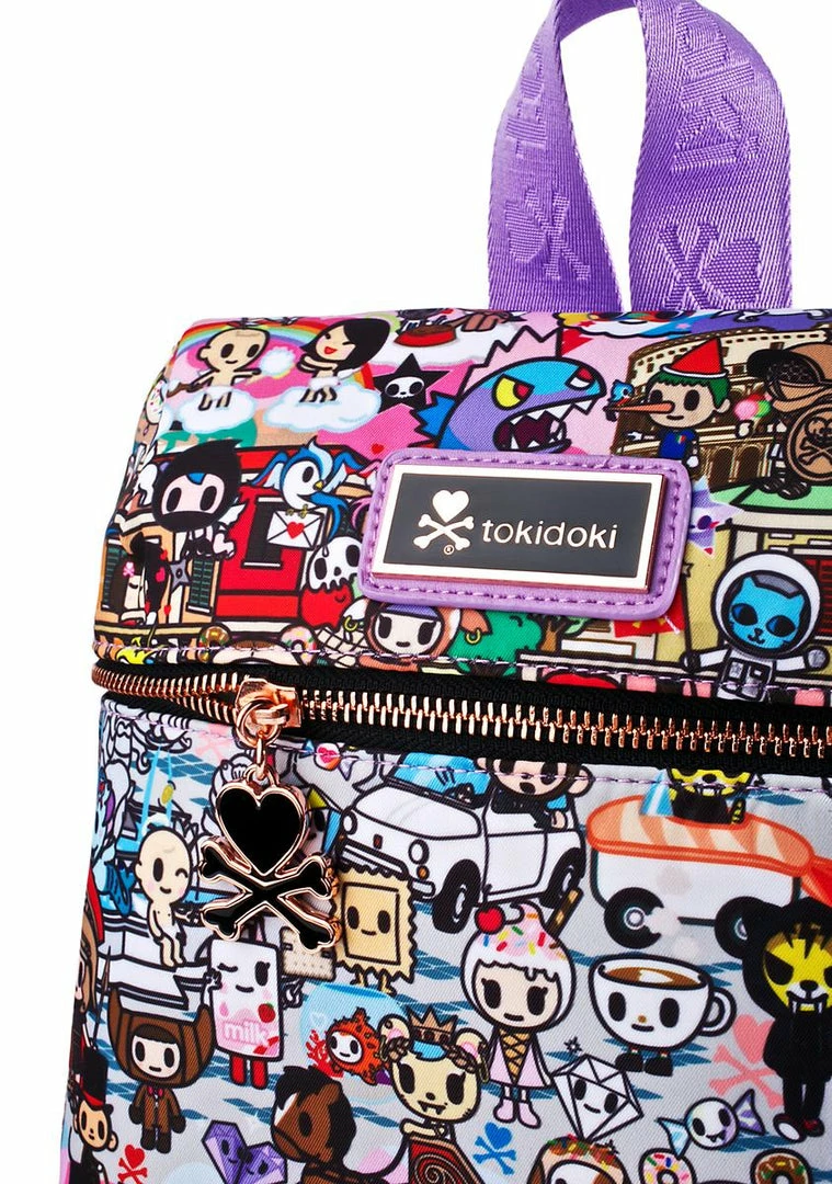 ciao, bella! Jetset in this adorable mini backpack featuring an allover print of Tokidoki characters in the greatest cities ever. With a roomy interior body and multiple inside pockets, this bb is complete with jacquard logo adjustable straps, locker loop detail, and a detachable mascot key charm.